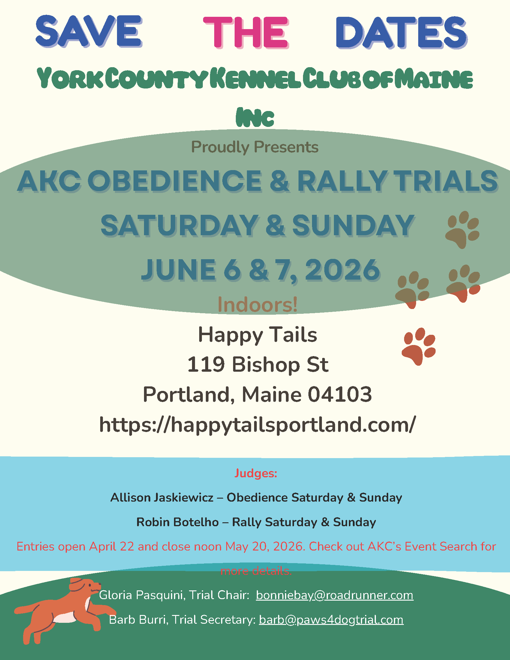119 Bishop St., Portland, ME 04109 119 Bishop Street, Portland, ME, United StatesWe are delighted to hold our 47th and 48th Obedience Trial and our 41st and 42nd Rally trial indoors again at Happy Tails in Portland. Our trials have received many accolades from exhibitors and judges, and we are pleased to keep  those compliments coming again this year at our June obedience and rally trials Entries for our June …